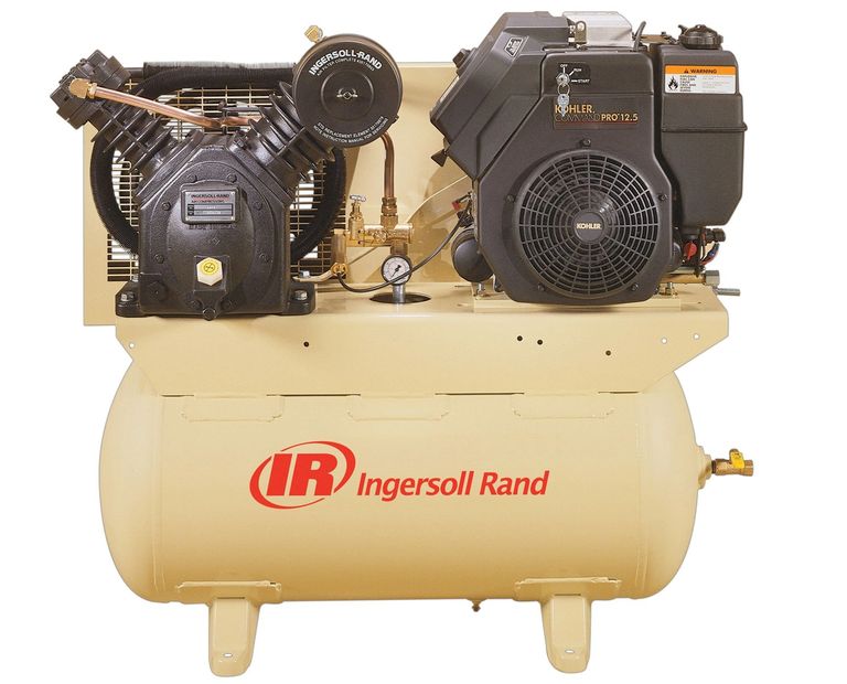 Esta unidad de compresor portátil de dos etapas Ingersoll Rand incluye una bomba compresora de hierro fundido al 100% en dos etapas, un motor de gasolina con arranque eléctrico y controles de accionamiento de motor de gas estándar.