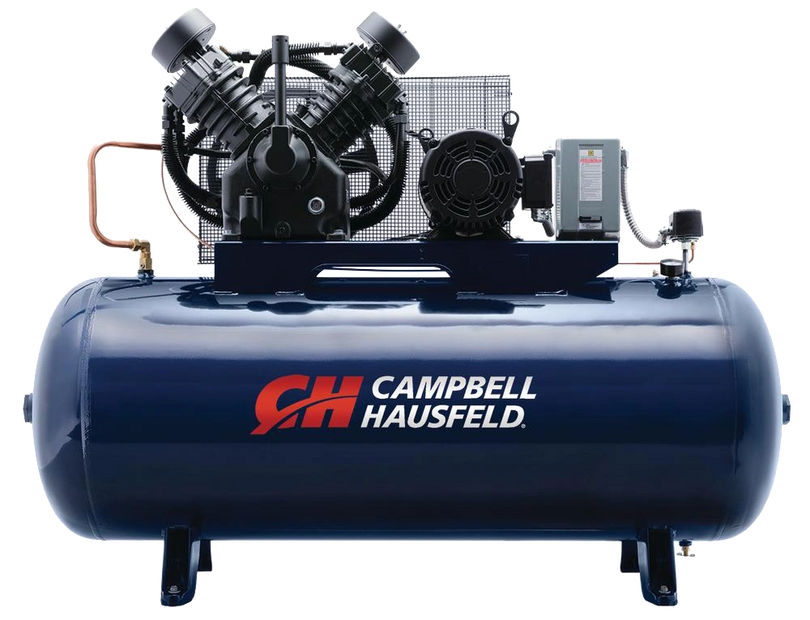 El compresor de aire Campbell Hausfeld de 120 galones, 10 hp, horizontal, de dos etapas (TX2113) es ideal para instalaciones de reparación de automóviles y puntos de venta de neumáticos. Este compresor de aire tiene un alto flujo de aire de 36 CFM a 90 PSI para alimentar múltiples herramientas de aire de alta demanda. Su motor NEMA con calificación industrial funciona con energía eléctrica trifásica, impulsando una bomba de dos etapas de hierro fundido y larga vida útil, diseñada para ofrecer más de 15,000 horas de operación. El cabezal de la bomba y la placa de la válvula presentan un diseño avanzado con juntas tóricas de alta temperatura Viton (r) para un sellado superior a alta presión en comparación con las juntas de papel. Para una operación suave y de baja vibración, el cigüeñal está fabricado de hierro dúctil y está equilibrado de manera óptima.
